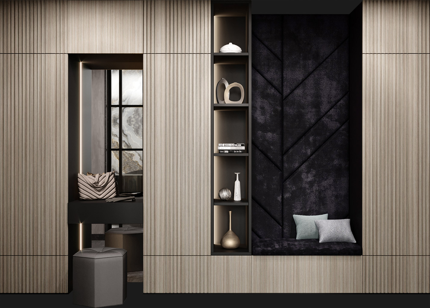 Продуманная конфигурация угловых шкафов обеспечивает экономию пространства и создает целостный гармоничный фасад.