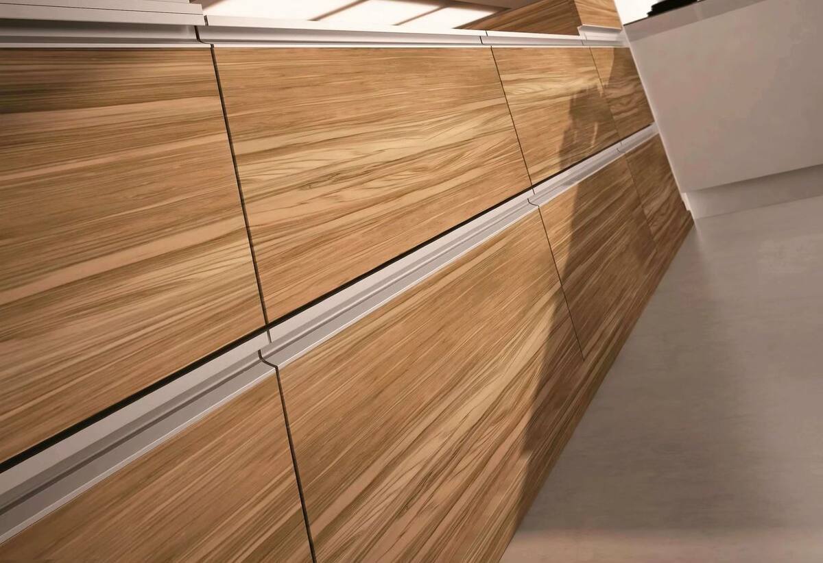 - Стабильность: В отличие от массива, шпонированные фасады не боятся перепадов влажности и температуры. Основа из МДФ не подвержена деформации, что гарантирует идеальную геометрию фасадов на долгие годы.
